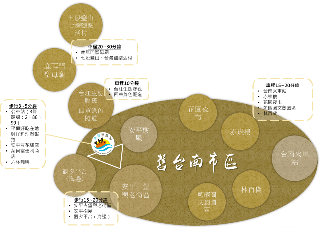前有河堤、散步至海邊約10分鐘,近台江國家公園、夕遊出張所、四草大橋、觀夕平台、安平樹屋、安平古堡、安平老街、遊憩碼頭(車程皆大概3分鐘,散步約10至25分鐘)。