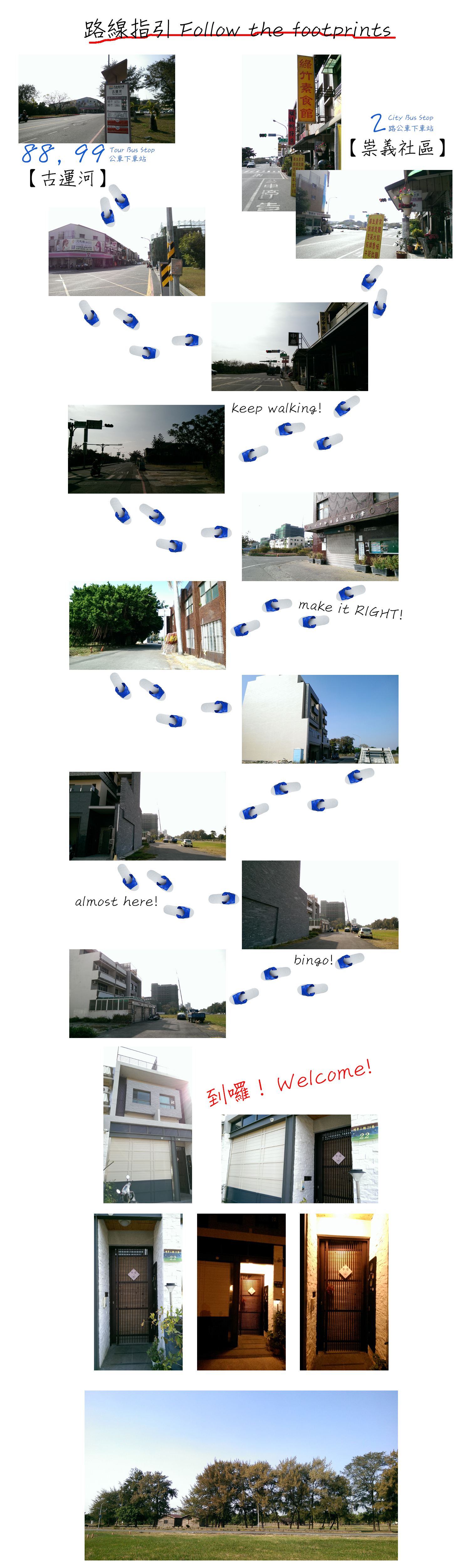 ● 自後站(前鋒路)出發:沿”前鋒路”往南邊(背對火車站之右手邊)直行約1分鐘→”民族路”右轉下地下道→約5分鐘遇到”中山路”左轉→約3分鐘遇圓環,”民生路”右轉→約10分鐘”民生路”變成”安平路”後繼續直行(左手邊是台南運河)→約5分鐘遇到”安北路”右轉→沿途經過古堡街(7-11)、夕遊出張所、萊爾富,請馬上留意”州平一街”的路牌,於”州平一街”右轉,於33號旁巷子進來,我們門牌為22號,門上有“安平作夥”春聯。